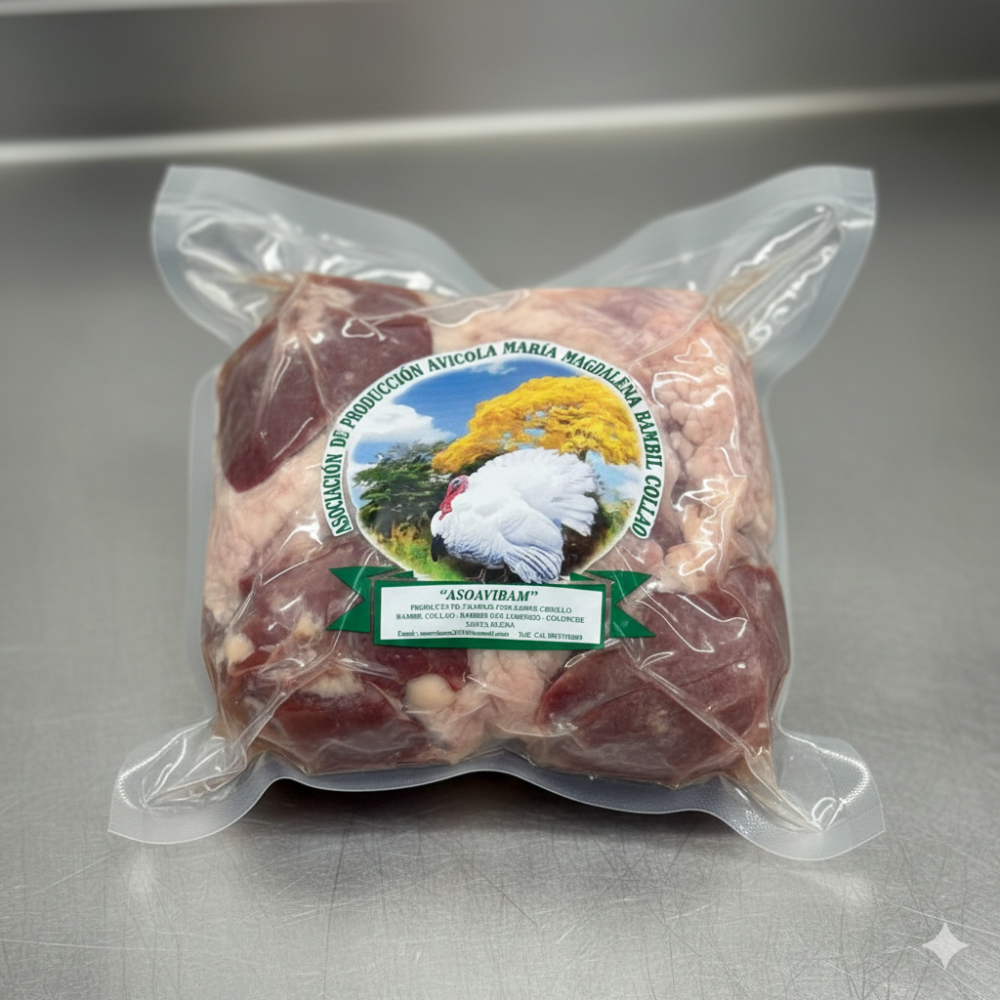 Paquetes de carne de pavo cruda, tanto en bolsas al vacío como en bandejas, etiquetados con un logotipo que muestra un ave blanca sobre un paisaje natural.